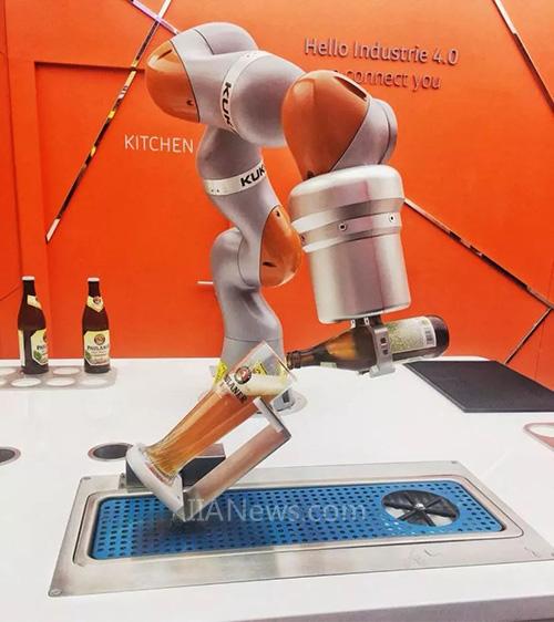 KUKA 家的展臺必有個吧臺區(qū),吧臺區(qū)里必有明星產(chǎn)品:LBR iiwa 的駐守。這款世界上首臺 7 軸靈敏型機器人,在“人機協(xié)作”領(lǐng)域里一直所向披靡,遇上展會這樣的機會,也總愛秀秀自己那精湛的倒啤酒絕技,這次,在吧臺區(qū),LBR iiwa 又收獲了一大幫迷弟迷妹!